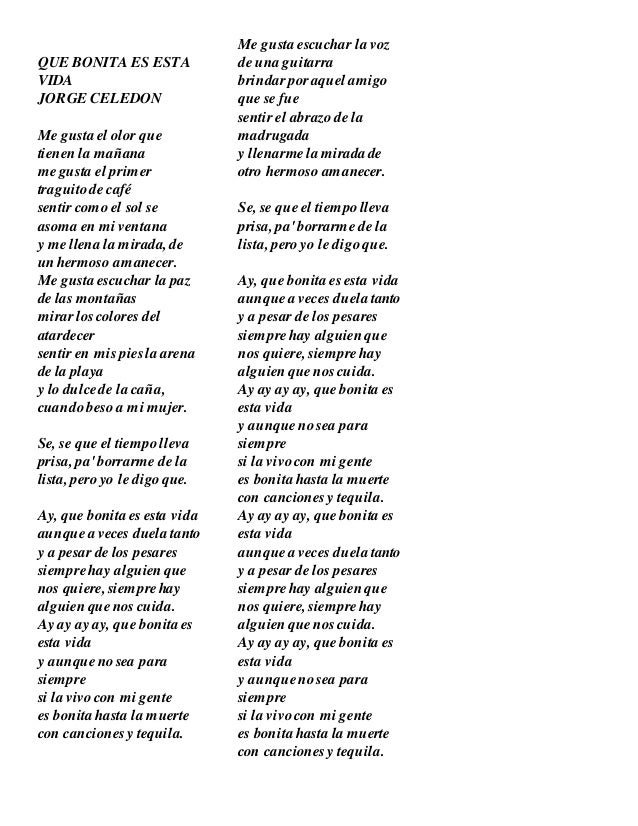 Y aunque no sea para siempre. Si la vivo con mi gente. Es bonita hasta la muerte con aguardiente y tequila. Ay ay ay ay, que bonita es esta vida. Aunque a veces duela tanto. Y a pesar de los pesares. Siempre hay alguien que nos quiere, siempre hay alguien que nos cuida. Ay ay ay ay, que bonita es esta vida.