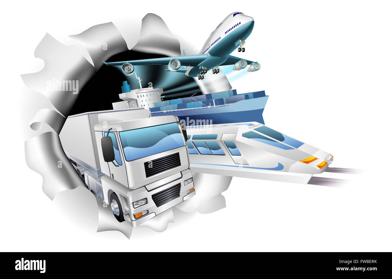 Ein Transport Fracht Export Logistikkonzept aus Zug, FrachtContainerSchiff, Flugzeug und LKW