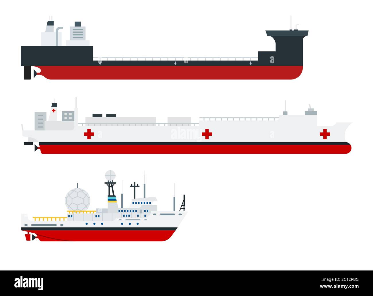 Illustration von verschiedenen Arten von Schiffen, Fracht, Krankenhaus und Forschungsschiff