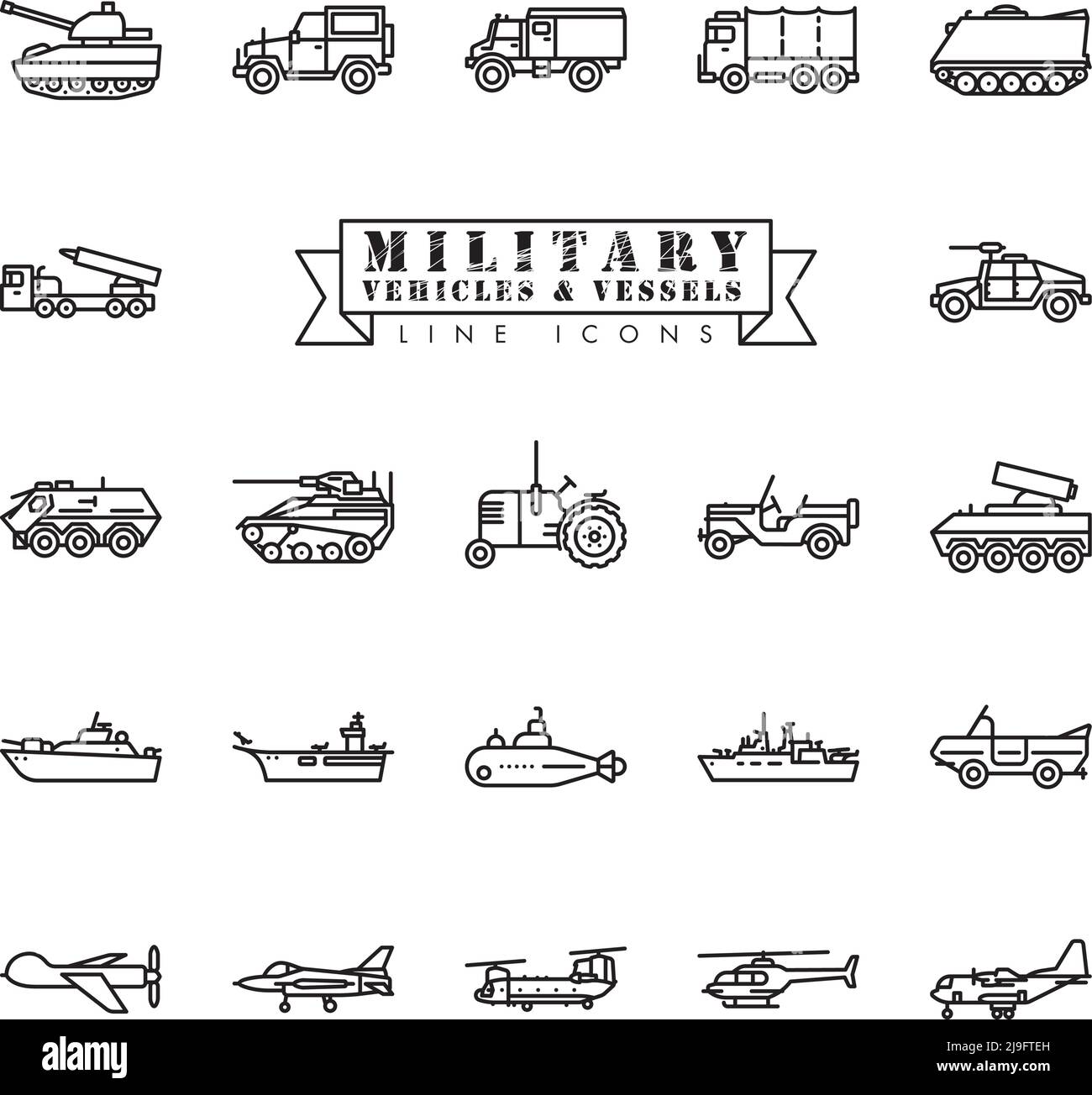 Sammlung von Militärfahrzeugen, Flugzeugen und Schiffen Linie Symbole. Satz von