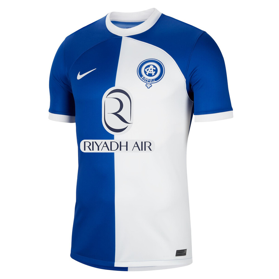 Célébration des 120 ans de l'Atlético de Madrid. Le kit extérieur 2023/24 est inspiré de leur première équipe et leur maillot 1/2 bleu/1/2 blanc comporte même l'écusson original du club porté entre 1903 et 1911.