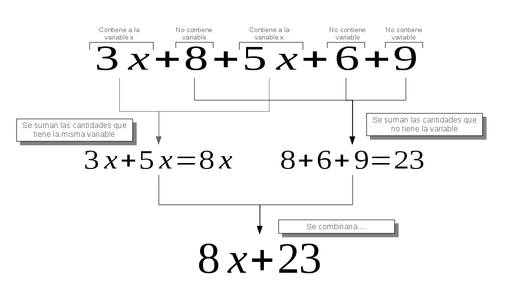 Esta suma puede llevarse a cabo con números reales, con expresiones algebraicas o con una combinación de ambas. También pueden sumarse vectores. Por ejemplo, la siguiente es una suma algebraica con números enteros y símbolos de agrupación: 2 + [- 10 + (−4 + 11 − 17)] Y esta otra involucra expresiones algebraicas y números reales.