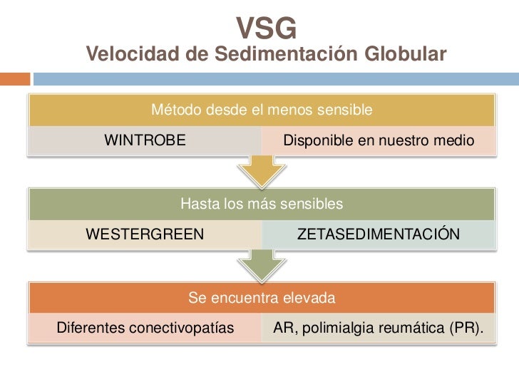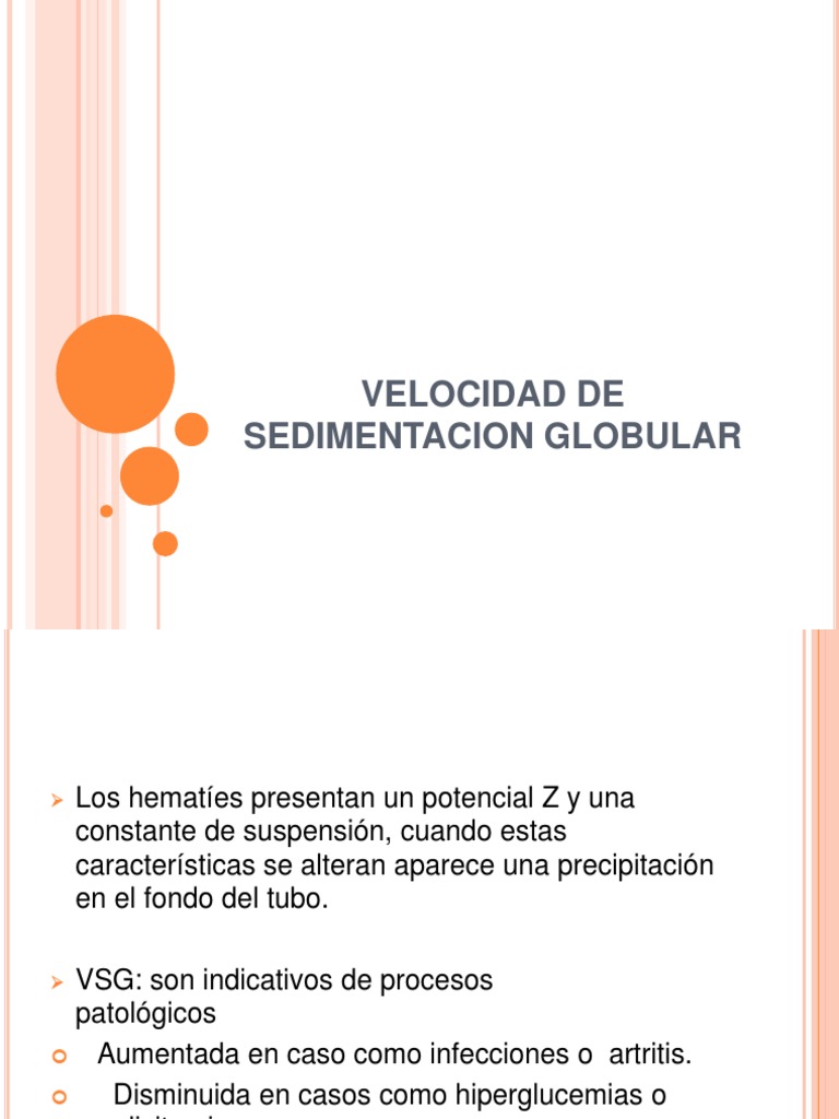 La velocidad de sedimentación globular (habitualmente referida como VSG) o eritrosedimentación es una prueba de laboratorio utilizada frecuentemente en medicina. 1 Consiste en medir la velocidad con la que sedimentan (decantan, caen) los glóbulos rojos o eritrocitos de la sangre, provenientes de una muestra de sangre periférica (tratada con.